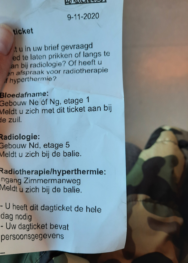 In het ziekenhuis was de maandag nog niet over natuurlijk! Want op het bonnetje dat je krijgt na het aanmelden staat "Bloedprikken, Radiologie" . Dus ik snapte al niet waarom ik naar de Radiologie moest. Omdat er een rij bij de liften stond, GING IK WEL EVEN MET DE TRAP NAAR DE 5E. Om daar erachter te komen dat ik ten eerste in het verkeerde gebouw sta, en dan te beseffen dat dit standaard op t bonnetje staat!